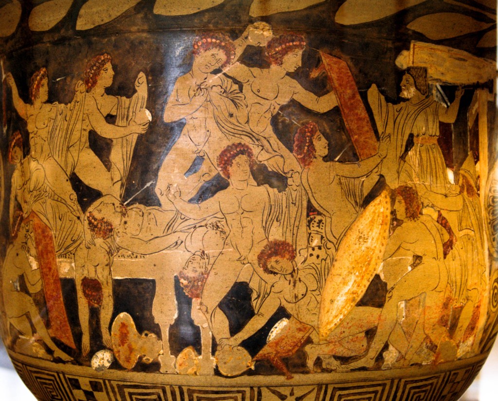 Slaughter of the suitors by Odysseus and Telemachus, Campanian red-figure bell-krater, c. 330 BC.