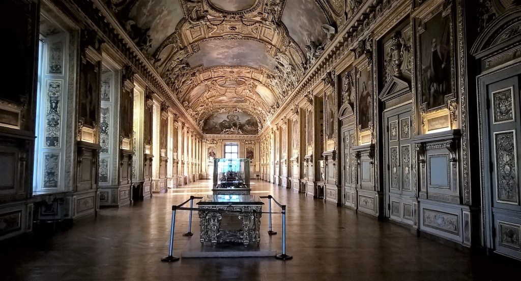 Hortense’s set (Robbed under a socialist’s government). Eugénie’s Tiara (Robbed under a socialist’s government). Set of Marie-Louise (Robbed under a socialist’s government). Couronne de Louis XV. The historical Regent diamond. Gallerie d’Apollon’s ceiling in details. Galerie d’Apollon 1660.